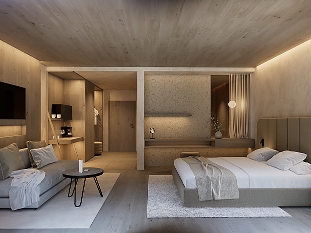 Junior suite for 2 to 5 people with south-facing terrace and private garden loggia, situated by the new outdoor infinity…