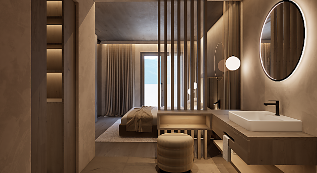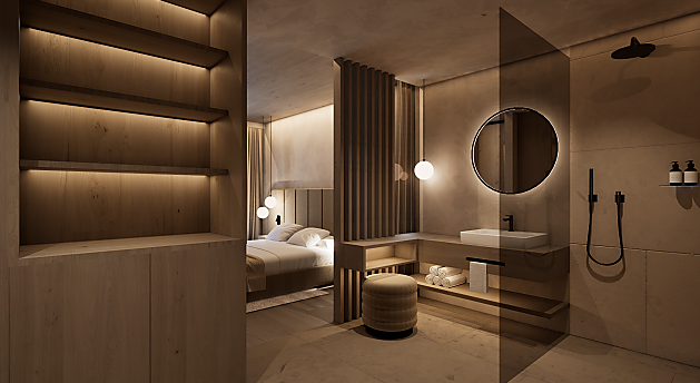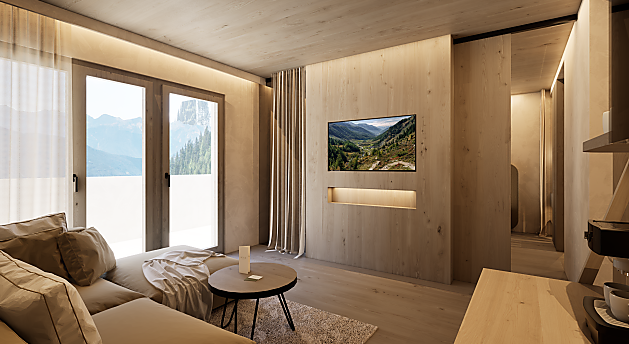 Spacious new suites for 2 to 4 persons on the 3rd floor with a panoramic south-facing balcony have a cozy living room, bathroom with shower, separate toilet with bidet, and are equipped with a designer refrigerator, hair dryer, makeup mirror, bathrobe, 2 TVs, W-LAN, safe and telephone.