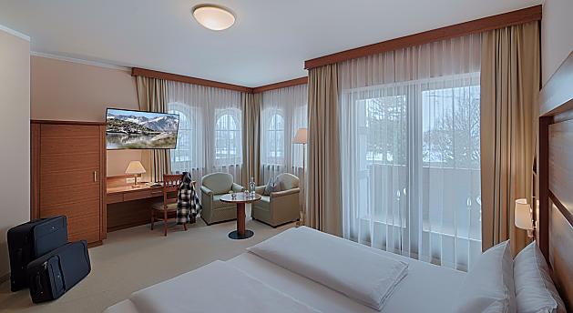 Le ampie suite da 2 a 5 persone con balcone esposto a sud sono dotate di una stanza da letto per bambini separata, un bagno con doccia e vasca, WC separato e bidet e sono attrezzate con asciugacapelli, specchio da trucco, accappatoio, due TV, WiFi, cassaforte e telefono.