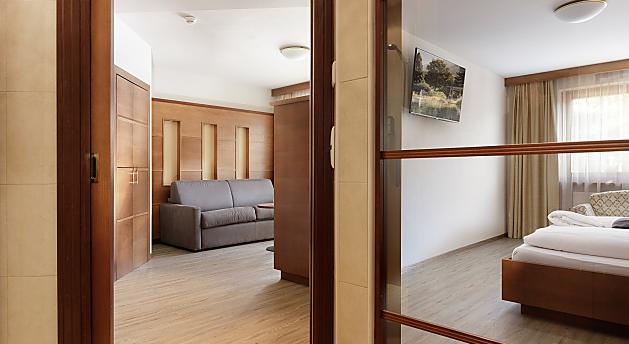 Le ampie suite da 2 a 5 persone con balcone e pavimento moderno in legno-design, sono dotate di un salottino accogliente, un bagno con doccia e vasca, WC separato e bidet e sono attrezzate con asciugacapelli, specchio da trucco, accappatoio, due TV, WiFi, cassaforte e telefono.
